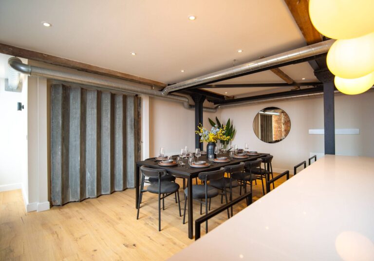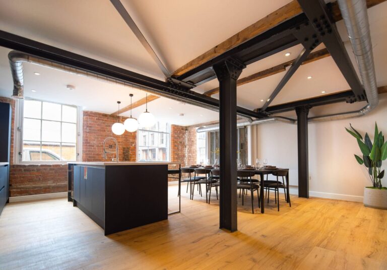 The building was constructed in the mid-19th century and formerly the home of the famous T Barlow Brothers Umbrella Factory, now a thoughtfully reimagined Grade II Listed sanctuary, offering a grand backdrop for convivial city get-togethers. Inside, each palatial room serves as a striking reminder of the building’s origins. Raw beautyin abundance, with red brick walls and expansive steel beams that instantly impresses. Inspiring colour combinations, provide for a somewhat autumnal sense of beauty by design. With allocated areas for both dinner parties and intimate evenings, this versatile space is the beating heart of the home.