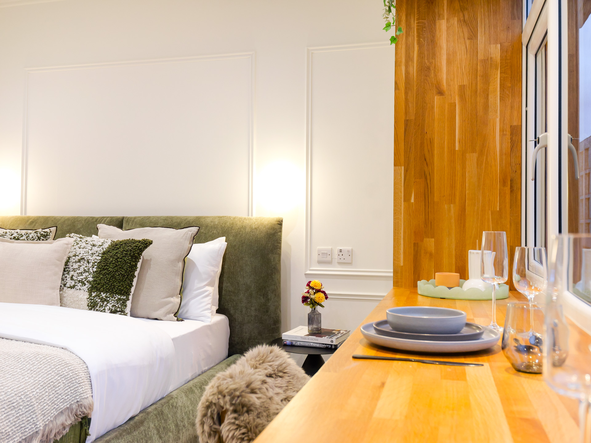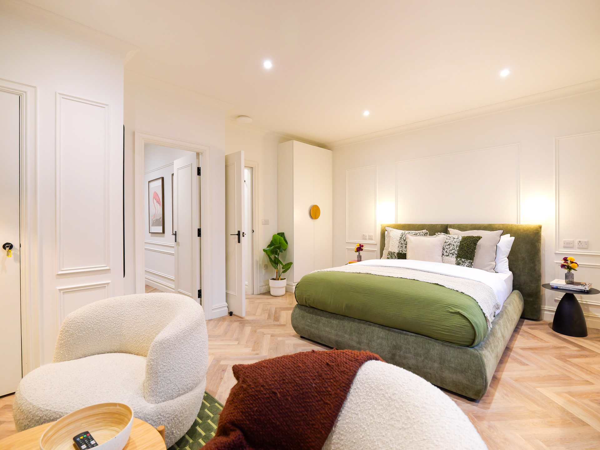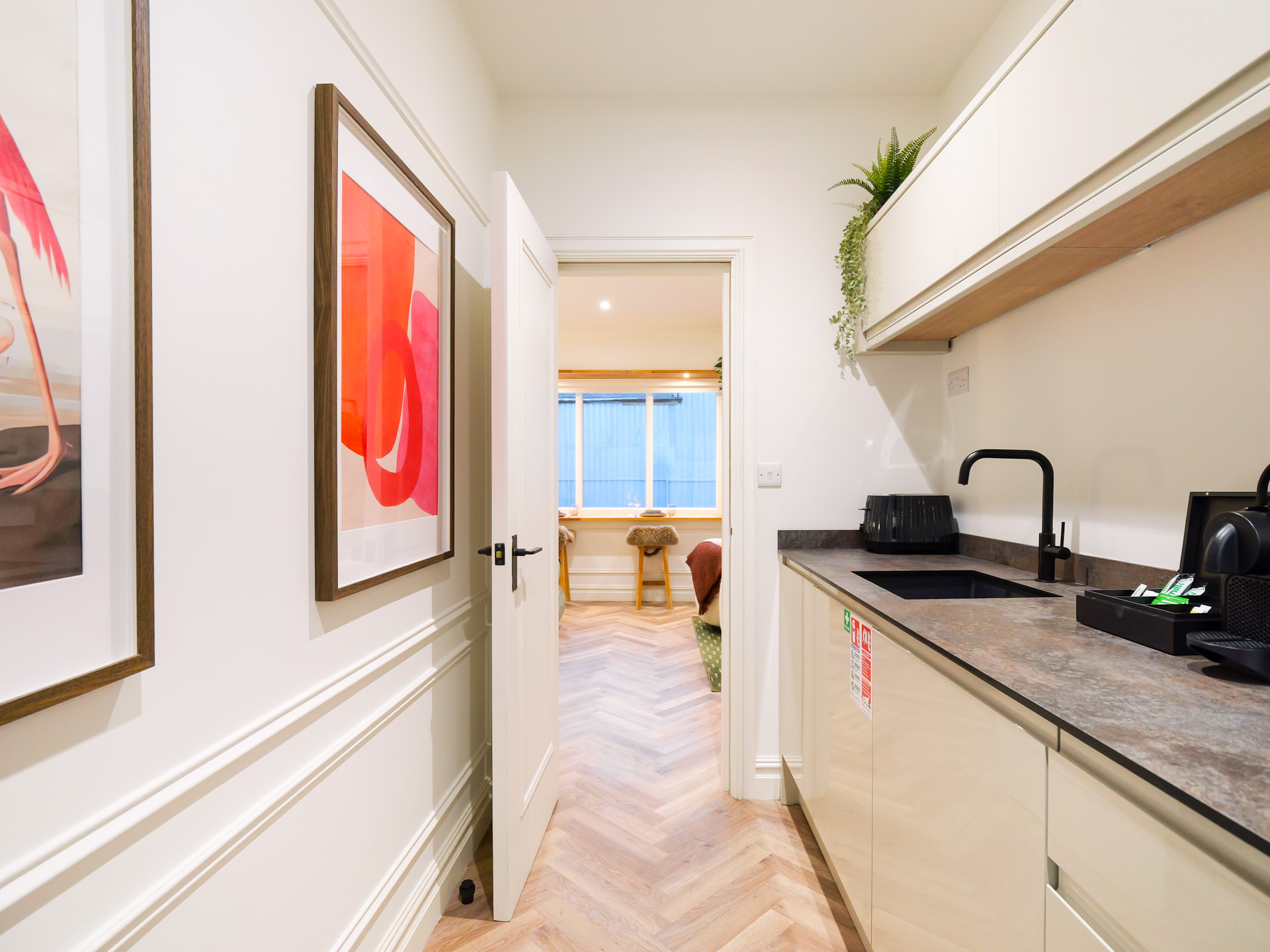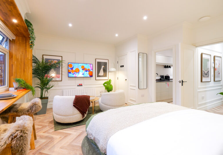 Inside, the atmosphere is warm and cocooning, shaped by rich tones, tactile materials and softly layered lighting. Bespoke joinery and curated textures create a sense of depth and comfort, offering a calm counterpoint to the vibrant energy outside. Modern conveniences are subtly integrated, including a full Sky Cable TV package with Sports and Movies, elevating everyday downtime. This is a studio designed for immersive city stays, where heritage, design and mood come together effortlessly.