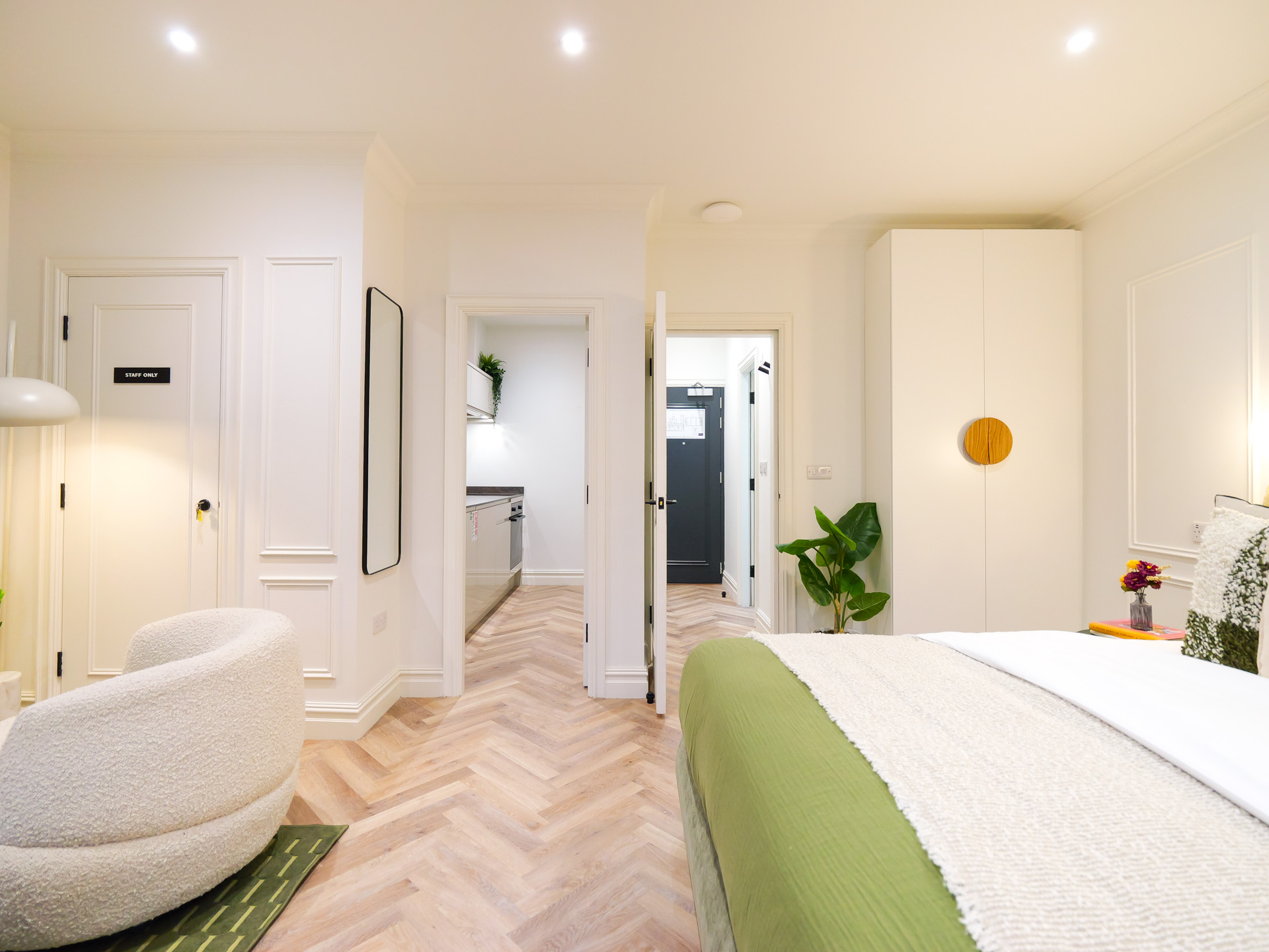 This residence is a thoughtfully designed 364 square foot studio set within The Heim’s flagship boutique aparthotel, located on iconic Oldham Street in the heart of Manchester’s Northern Quarter. Positioned within a beautifully restored historic building dating back to the mid to late eighteen hundreds, the home unfolds across a single open plan floor, seamlessly blending living, sleeping and dining into one considered space. The building was carefully converted in 2025, preserving its original character and charm. Once home to the legendary Dry Bar owned by Factory Records, this address sits at the centre of Manchester’s cultural story, surrounded by late night bars, independent shops and celebrated restaurants.
